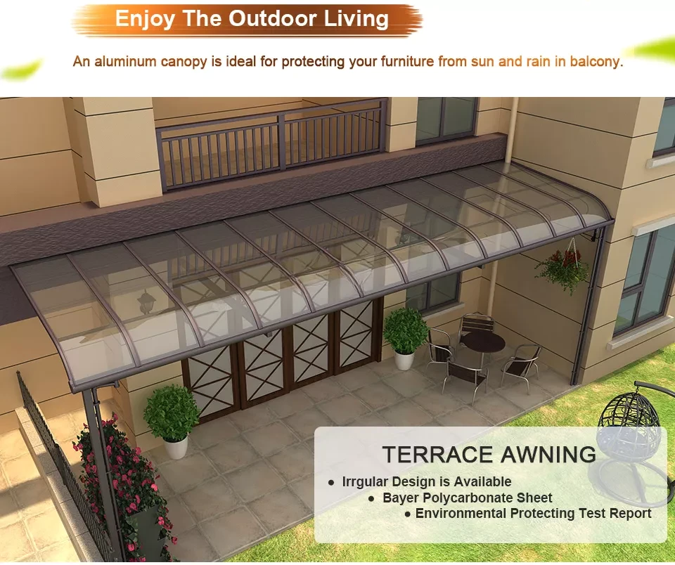 ALUNOTEC Patio Awning is as one of our hot selling products, well received by clients. Aluminum framework with polycarbonate sheet. Resist sunlight, wind and rain. Also offering a good decoration effect.